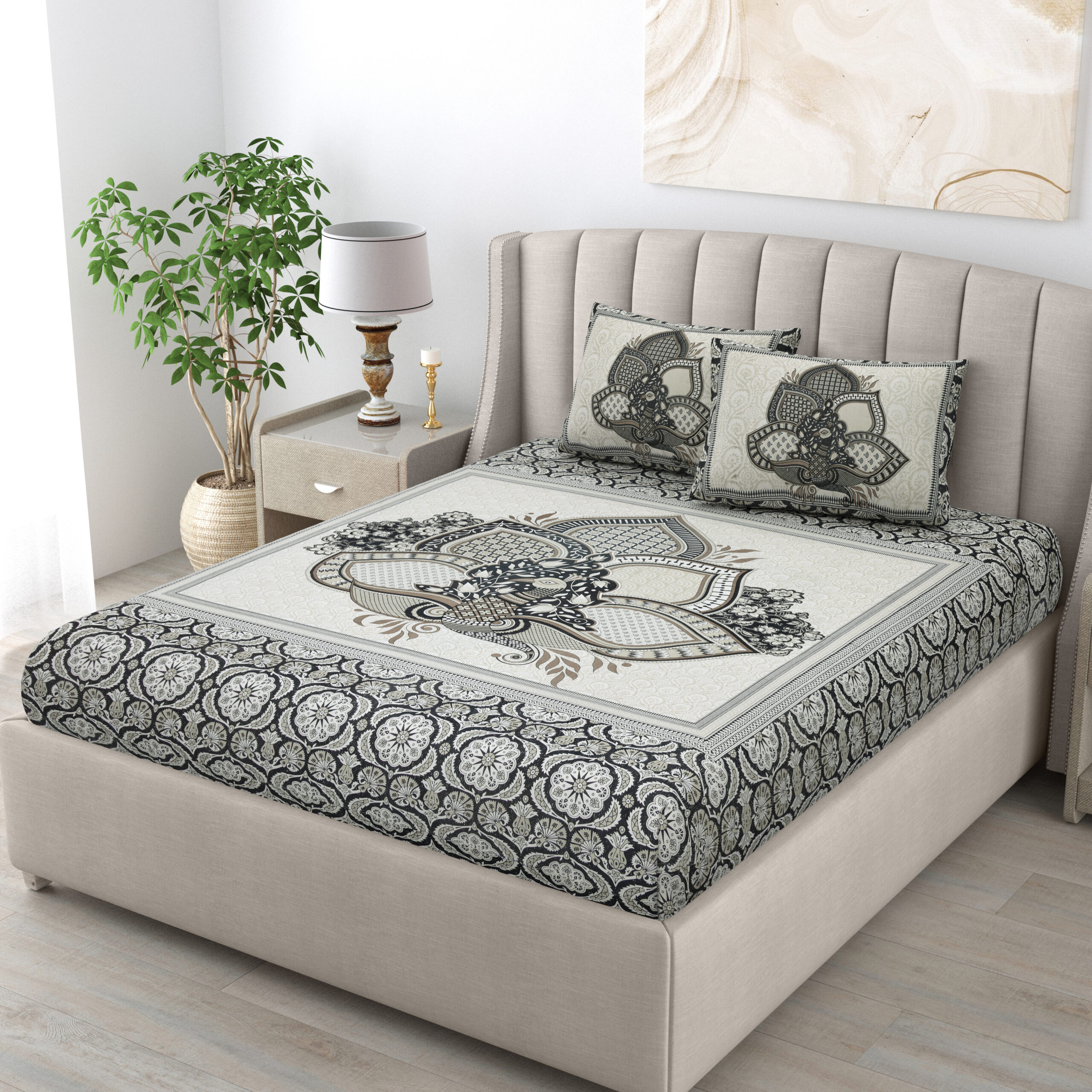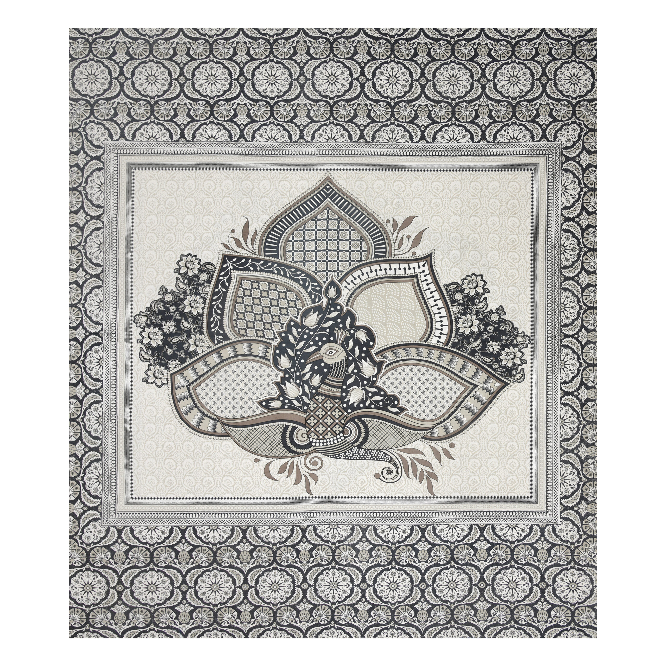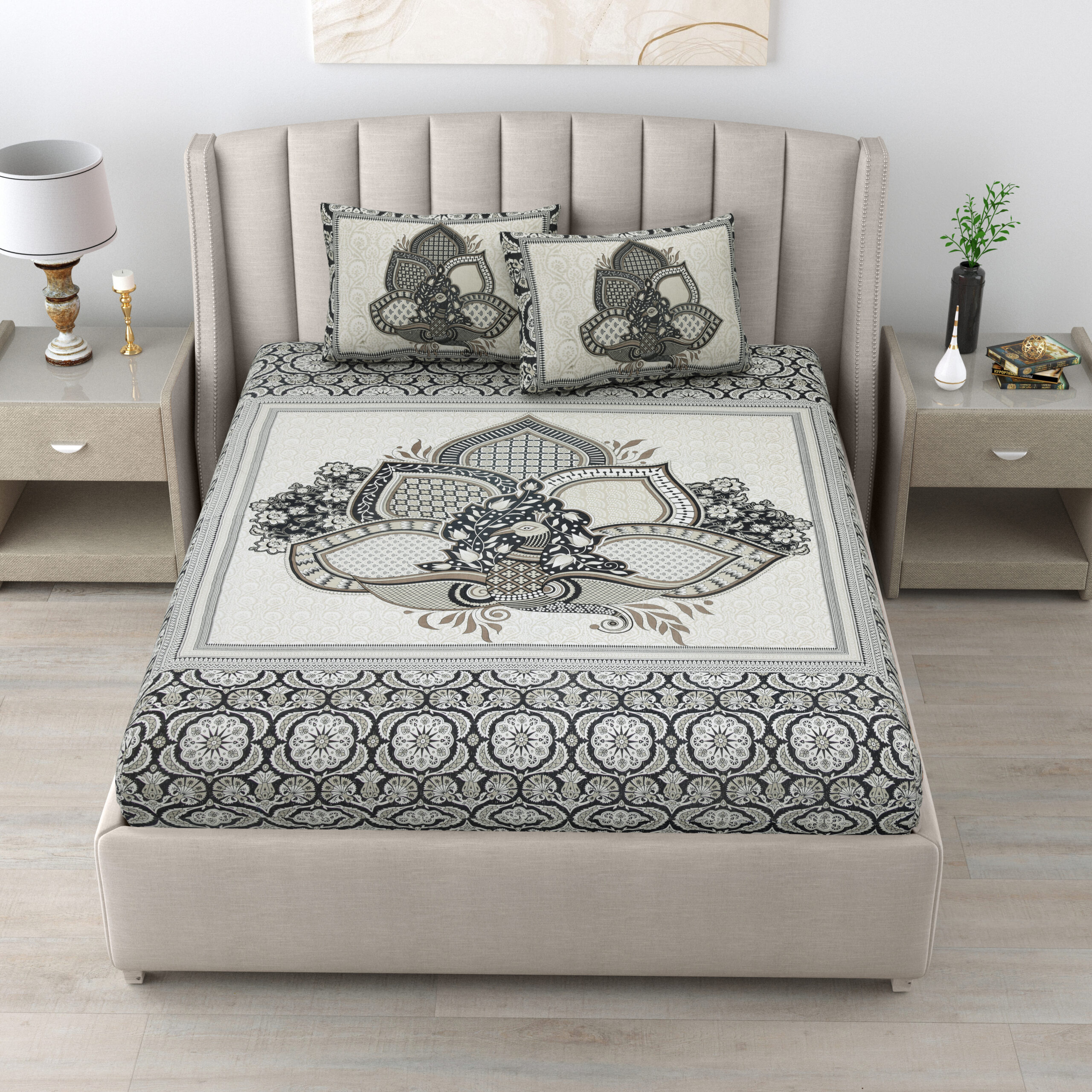 Experience luxury with “HOMEMOODS” exquisite lotus peacock bedsheet, where detailed artistry meets comfort and durability for a perfect night’s sleep.