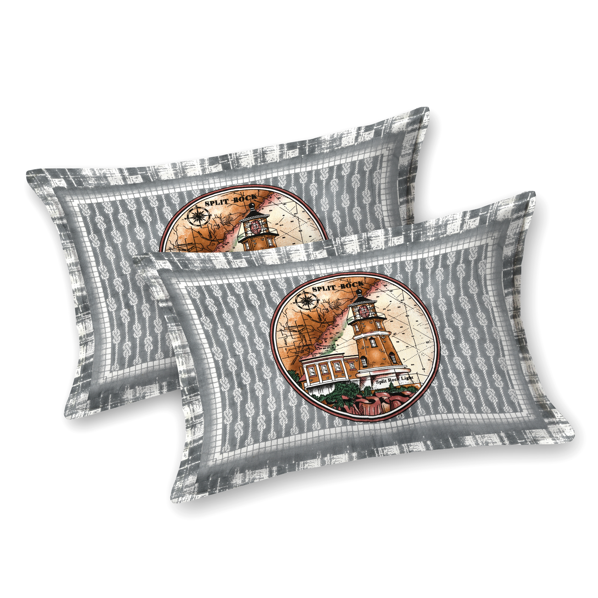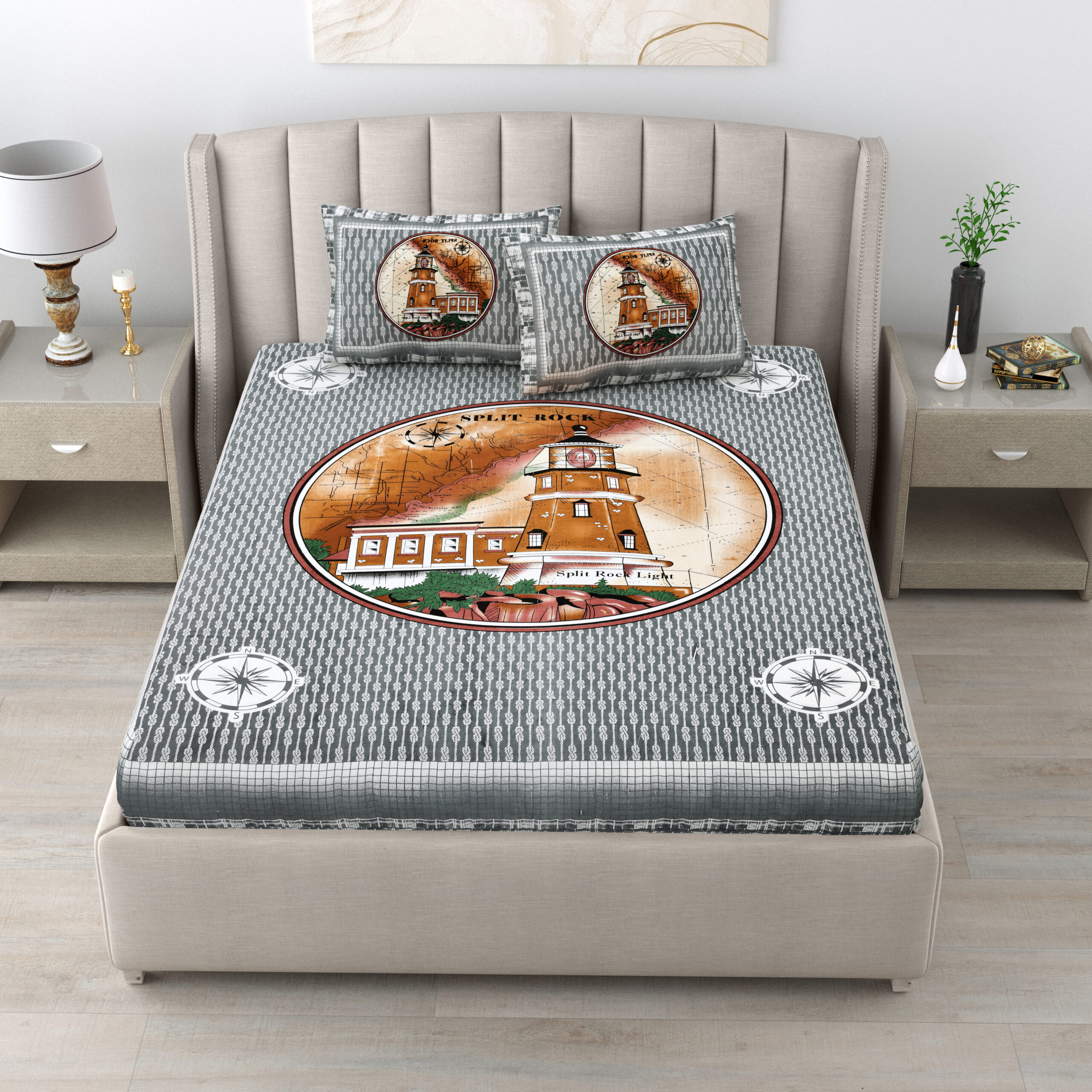 Coastal-inspired bedsheet featuring a vintage lighthouse and compass design in soothing earthy tones for a calm, nautical vibe. Elevate your space with “HOMEMOODS” blend of comfort, quality, and design.
